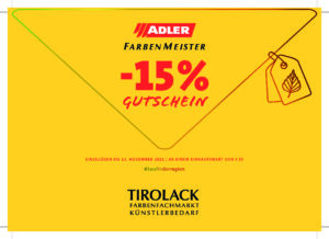der Herbst hat Einzug gehalten – und der Winter steht schon vor der Tür. Bevor Sie den grauen Gesellen einlassen, holen Sie sich doch noch ein bisschen sommerliche Wärme ins Haus: mit den schönsten Farben, die das Tirolack-Sortiment zu bieten hat! Ein behagliches Weinrot für die Wohnzimmerwand, ein kräftiges Dunkelgrün für die Kommode – oder ein fröhliches Farbpotpourri für Ihre schönsten Kunstwerke. Egal, wofür Ihr Heimwerker-Herz schlägt, wir unterstützen Sie gerne mit fachkundiger Beratung, besten Produkten, ausgezeichnetem Service – und einem Rabatt von 15 % auf unser gesamtes Sortiment! Kommen Sie vorbei und zeigen Sie dem Winter die bunte Schulter – wir freuen uns auf Sie!