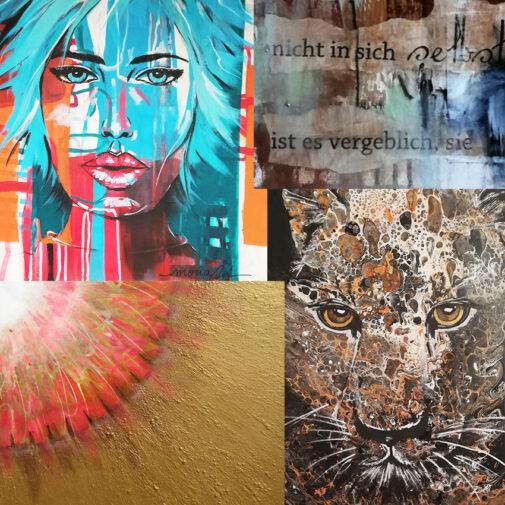 Für Anfänger und Fortgeschrittene bietet der Kurs ein Spektrum verschiedener Techniken. Hier kann man verschiedene Maltechniken ausprobieren oder sich auch nur für eine besondere Vorliebe entscheiden. Wir arbeiten mit Arylfarben auf kleinen und großen Leinwänden mit verschiedenen Materialien. Freie Motivwahl.