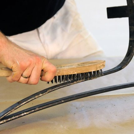 Abblätternde Lackschichten, Rost und groben Schmutz entfernen Sie von den Metallelementen mit einer Drahtbürste.