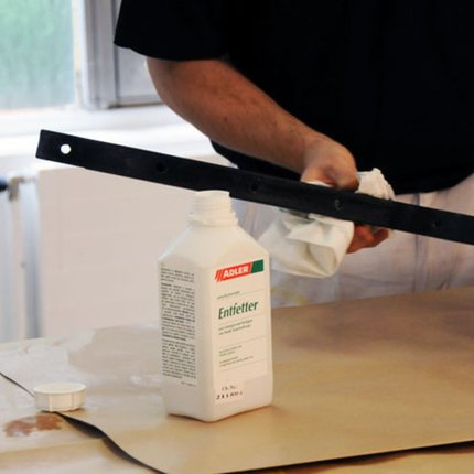 Für die gründliche Reinigung schleifen Sie mit einem Schleifvlies und ADLER Entfetter über die Metalloberflächen. Nach 5-10 min Einwirkzeit können Sie mit klarem Wasser nachwaschen und alles trocknen lassen.