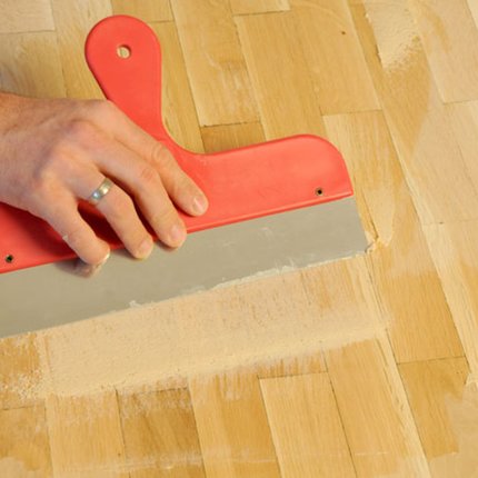 Bevor Sie die Schleifarbeiten abschließen, kontrollieren Sie den verklebten Parkettboden auf Risse und Fugen. Ausbessern und verschließen können Sie diese mit ADLER Floor-Fill. Nehmen Sie den feinen und sauberen Schleifstaub des vorletzten Schleifvorganges und vermischen Sie Ihn mit ADLER Floor-Fill. Eine spachtelähnliche Masse entsteht. Damit können Sie die Risse und Fugen auffüllen. Nach 1 bis 1,5 Stunden ist alles trocken und Sie können die letzten Unebenheiten mit dem letzten feinen Schliff beseitigen.