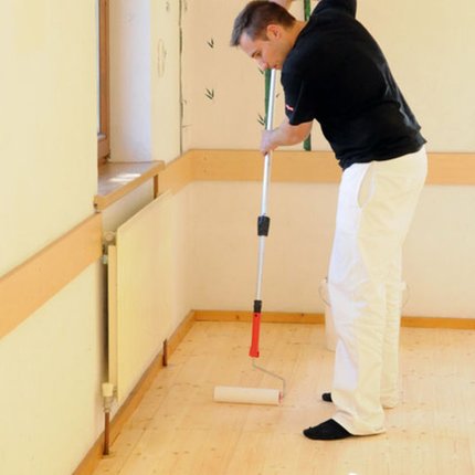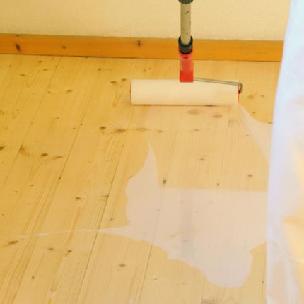 Entfernen Sie den Staub gründlich, bevor Sie mit dem Grundieren anfangen. Saugen Sie den feinen Staub auf und wischen Sie mit einem feuchten Tuch nach. Wenn alles trocken ist, können Sie ADLER Floor-Start entlang der Holzmaserung auftragen. Dazu eignet sich ein passenderKurzhaarroller, mit dem Sie den Boden in Bahnen grundieren. Parallel dazu grundieren Sie die Ecken mit einem Wasserlackpinsel.