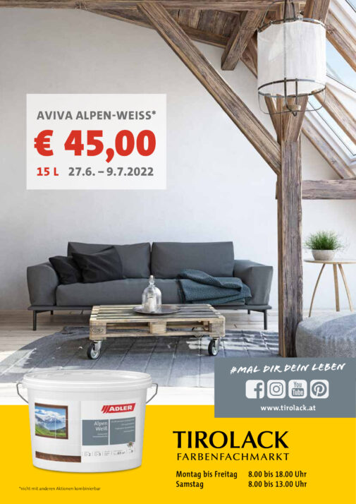 der Schnee ist jetzt zur Gänze auf unseren Bergen geschmolzen und der ersehnte Sommer ist endlich eingekehrt. Wer sich trotzdem das WEISS der Alpen ins Haus holen möchte, der ist bei uns genau richtig. Bis einschließlich 9. Juli haben wir ein tolles Angebot für sie kreiert. Unsere Wohnraumfarbe Aviva Alpen Weiss ist in diesem Zeitraum reduziert. Pro 15 Liter Eimer (reicht für ca. 105m²) zum absoluten Spitzenpreis von 45 Euro.