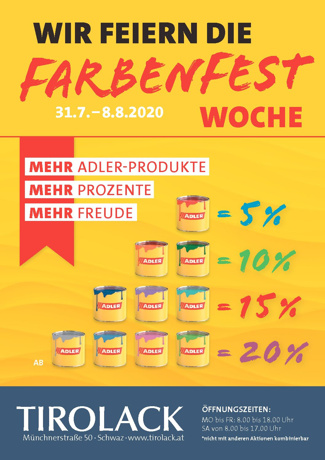 Wir feiern die Farbenfestwoche und als ADLER Farbenmeister machen wir es möglich! Beim Kauf von ADLER Qualität sparen Sie jetzt bis zu minus 20% und setzen obendrein ein wichtiges Zeichen für die Umwelt und heimische Qualität. Denn ADLER produziert CO2-neutral in Österreich.