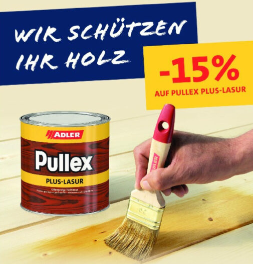 Minus 15% Aktion  vom 12.10 – 24.10.20 gültig auf alle lagernden Pullex Plus Holzschutzproukte!