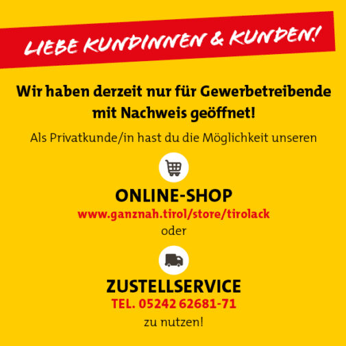 Wie sagt unser Herr Landeshauptmann so schön… “Es nutzt nix, bleibt`s noamol dahoam”! Wir sind trotzdem für euch da und bringen euch Eure Farben bis an die Haustüre. Es gibt auch die Möglichkeit über unseren ONLINESHOP zu bestellen.