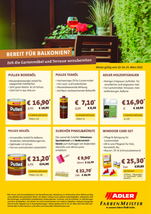 Das Leben ist bunt und braucht auch im Außenbereich Farbe. Es wird Zeit die Gartenmöbel und die Terrasse vorzubereiten! Terrassen- und Holzböden im Außenbereich müssen einiges aushalten. Sie sind ständig unterschiedlichen Witterungen und UV-Strahlen ausgesetzt. Sie sollten diesen regelmäßig mit unserem hochwertigen Pullex Bodenöl einlassen.