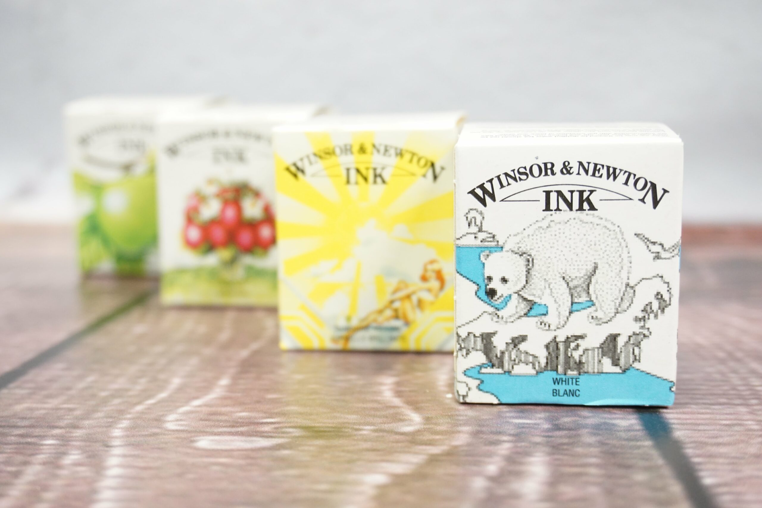 Schreib- und Zeichentusche für Feder, Pinsel, Spritzpistole (nicht für Füllfederhalter) auf Basis löslicher Farbstoffe und Schellack bzw. auf Pigmentbasis (nur Black und White), transparent (außer Black, White, Silver und Gold), wasserbeständig (außer Liquid Indian Ink, Silver und Gold), schnell trocknend, wasserverdünnbar, untereinander mischbar, nicht lichtbeständig (außer Black, White, Silver und Gold)