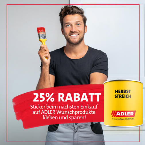 Bunte Prozente von ADLER flattern ins Haus. Sichern Sie sich jetzt 10% 15% 20% und sogar 25% RABATT auf ein Produkt ihrer Wahl und holen Sie sich noch ein bisschen sommerliche Wärme ins Haus: mit den schönsten Farben, die das Tirolack-Sortiment zu bieten hat!